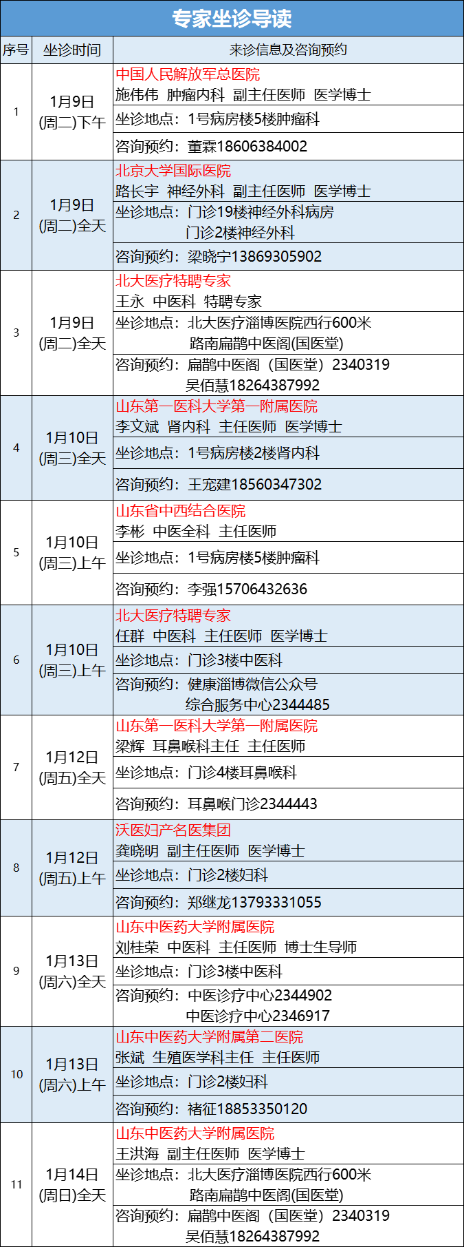 1月8日——1月14日(周一至周日)中國(guó)人民解放軍總醫(yī)院腫瘤內(nèi)科副主任醫(yī)師施偉偉,山東第一醫(yī)科大學(xué)第一附屬醫(yī)院腎內(nèi)科主任醫(yī)師李文斌,山東中醫(yī)藥大學(xué)第二附屬醫(yī)院生殖醫(yī)學(xué)科主任醫(yī)師張斌,原北京協(xié)和醫(yī)院副主任醫(yī)師龔曉明等11位名醫(yī)將來(lái)北大醫(yī)療淄博醫(yī)院(淄博經(jīng)開(kāi)區(qū)醫(yī)院)坐診。廣大市民如有就診需求,可以通過(guò)電話、現(xiàn)場(chǎng)咨詢等方式提前預(yù)約。