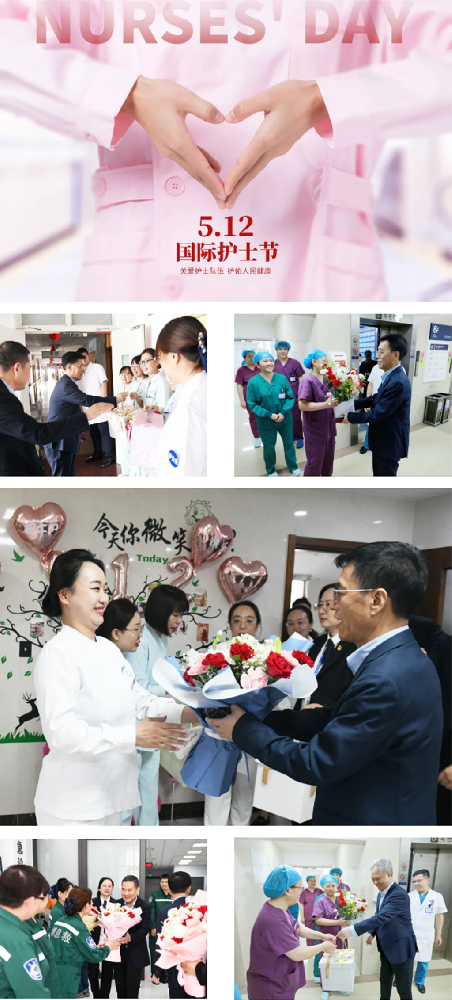 5月12日上午,在第 114 個國際護(hù)士節(jié)來臨之際,北大醫(yī)療聯(lián)席總經(jīng)理兼北大醫(yī)療魯中醫(yī)學(xué)中心主任、黨委書記,總院院長、魯中 / 淄博院區(qū)院長周玉東總,中心副主任、總院執(zhí)行院長王繼東、曲勇,中心(總院)CFO朱韶輝,北大醫(yī)療董事長特別助理陳黎明及其他領(lǐng)導(dǎo)班子成員分別走進(jìn)魯中院區(qū)和淄博院區(qū),代表北大醫(yī)療集團(tuán)朱友剛書記向奮戰(zhàn)在臨床一線的護(hù)理工作者致以節(jié)日的問候和崇高的敬意,并送上鮮花和節(jié)日慰問品,將醫(yī)院的溫暖關(guān)懷傳遞至每位護(hù)士心中。