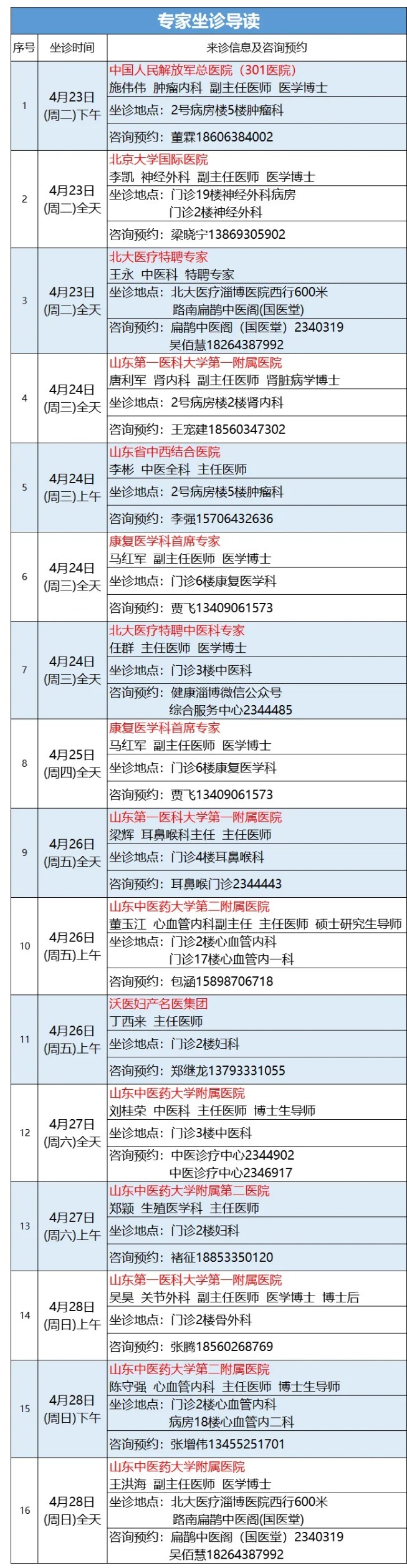 4月22日——4月28日(周二至周日)中國人民解放軍總醫(yī)院腫瘤內(nèi)科副主任醫(yī)師施偉偉,北京大學(xué)國際醫(yī)院神經(jīng)外科副主任醫(yī)師李凱,山東第一醫(yī)科大學(xué)第一附屬醫(yī)院耳鼻喉科主任醫(yī)師梁輝,山東中醫(yī)藥大學(xué)第二附屬醫(yī)院心血管內(nèi)科科主任醫(yī)師陳守強,山東中醫(yī)藥大學(xué)附屬醫(yī)院主任醫(yī)師劉桂榮等14位名醫(yī)將來北大醫(yī)療淄博醫(yī)院(淄博經(jīng)開區(qū)醫(yī)院)坐診。廣大市民如有就診需求,可以通過電話、現(xiàn)場咨詢等方式提前預(yù)約。